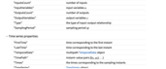 "InputsCount" 输入的数量 "InputVariables" 输入变量 u "OutputsCount" 输出的数量 "OutputVariables" 输出变量 y "Type" 输入-输出关系的类型 "SamplingPeriod" 采样周期 sp - 时间序列的属性: