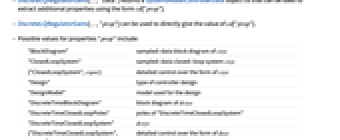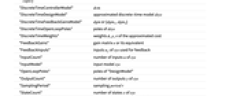"BlockDiagram" csys 的采样数据框图 "ClosedLoopSystem" csys 的采样数据闭环系统 {"ClosedLoopSystem",cspec} 对 csys 形式的详细控制 "Design" 控制器设计的类型 "DesignModel" 设计所用的模型 "DiscreteTimeBlockDiagram" dcsys 的框图 "DiscreteTimeClosedLoopPoles" "DiscreteTimeClosedLoopSystem" 的极点 "DiscreteTimeClosedLoopSystem" dcsys {"DiscreteTimeClosedLoopSystem",cspec} 是否合并离散时间闭环系统 dsys "DiscreteTimeControllerModel" dcm "DiscreteTimeDesignModel" 近似离散时间模型 dsys "DiscreteTimeFeedbackGainsModel" dgm 或 {dgm1,dgm2} "DiscreteTimeOpenLoopPoles" dsys 的极点 "DiscreteTimeWeights" 近似成本函数的权重 ϕ、ρ、π "FeedbackGains" 增益矩阵 κ 或其等价物 "FeedbackInputs" 用 sys 的 uf 作为反馈 "InputCount" sys 的输入 u 的个数 "InputModel" 输入模型 sys "OpenLoopPoles" "DesignModel" 的极点 "OutputCount" sys 的输出 y 的个数 "SamplingPeriod" 采样 period τ "StateCount" sys 的状态 x 的数量 "TrackedOutputs" 被跟踪的 sys 的输出 yt - cspec 的密钥包括: