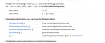StateSpaceModel[…] 线性控制输入和线性状态 AffineStateSpaceModel[…] 线性控制输入和非线性状态 NonlinearStateSpaceModel[…] 非线性控制输入和非线性状态 SystemModel[…] 一般系统模型 <|…|> 用 Association 给出的详细系统指定 - 详细系统指定中可含有以下键: