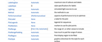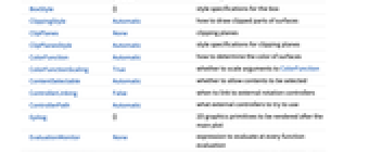 Axes True 是否绘制坐标轴 BoxRatios {1,1,0.4} 三维框界定比例 ClippingStyle Automatic 如何绘制曲面的裁剪部分 ColorFunction Automatic 如何确定曲面的颜色 ColorFunctionScaling True 是否根据 ColorFunction 缩放参变量 EvaluationMonitor None 在每个函数被求值时要求值的表达式 ExtentElementFunction Automatic 如何生成一个原始图以便作延伸填充 ExtentMarkers None 用于延伸边界的标符 ExtentSize Automatic 从绘制点作延伸的宽度和深度 Filling Automatic 每一个曲面下的填充 FillingStyle Opacity[0.5] 填充所用的样式 Joined False 是否连接 LabelingFunction Automatic 如何标签点 LabelingSize Automatic 标注和标签的最大尺寸 Method Automatic 所用的方法 PerformanceGoal $PerformanceGoal 性能上试图要优化的方面 PlotLegends None 序列的图例 PlotMarkers None 绘制点时使用的标记 PlotRange {Full,Full,Automatic} 所要包含的
