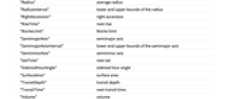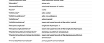 "AlphanumericName" 英数字による名前 "AlternateNames" 別名 "Altitude" 高度 "AltitudeTransit" 次の子午線通過高度 "AngularDiameterFromEarth" 地球から見える角直径 "AngularRadiusFromEarth" 地球から見える角半径 "ApparentAltitude" 視高度 "AverageOrbitDistance" 軌道の平均距離 "Azimuth" 方位角 "AzimuthRise" 出の方位角 "AzimuthSet" 入の方位角 "BooleanRise" 地平線上 "Classes" クラス "Component" 成分 "Constellation" 星座 "DailyTimeAboveHorizon" 地平線の上にある1日の時間 "Declination" 赤緯 "Density" 平均密度 "Diameter" 平均直径 "DiameterInterval" 直径の上界と下界 "DiscoveryMethod" 発見方法 "DiscoveryYear" 発見年 "DistanceFromEarth" 地球からの距離 "DistanceInterval" 地球からの距離の上界と下界 "DistanceFromSun" 太陽からの距離 "DurationTransit" 子午線通過時間 "Eccentricity" 軌道の離心率 "EccentricityInterval" 離心率の上界と下界 "EscapeVelocity" 脱出速度 "GalacticLatitude" 銀緯 "GalacticLongitude" 銀経 "GeocentricEclipticLatitude" 地心黄道緯度 "GeocentricEclipticLongitude" 地心黄道経度 "GravitationalConstantMassProduct" 標準的な引力パラメータ "Gravity" 引力 "GreenwichHourAngle" グリニッジ時角 "HeliocentricEclipticLatitude" 日心黄道緯度 "HeliocentricEclipticLongitude" 日心黄道経度 "HelioCoordinates" 日心XYZ座標 "Inclination" 軌道傾斜 "InclinationInterval" 傾斜の上界と下界 "LocalHourAngle" 地方時角 "MajorAxis" 長軸 "Mass" 質量 "MassInterval" 質量の上界と下界 "MaximalAltitudeTime" 次の最大高度時 "MinorAxis" 短軸 "MomentOfInertia" 慣性の回転モーメント "Name" 名前 "OrbitCenter" 軌道の中心 "OrbitCircumference" 軌道の外周 "OrbitPeriod" 軌道周期 "OrbitPeriodInterval" 軌道周期の上界と下界 "PeriapsisLongitude" 近点
