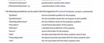 "Qualifiers" 特性の可能な限定子のリスト "QualifierValues" 各限定子に与えることができる値のリスト "DefaultQualifierValues" 特性の限定子のデフォルト値のリスト "Description" 特性のテキストによる簡単な説明 "Definition" 特性のテキストによる詳細な定義 "Source" 特性の出典情報 "Date" 実体と特性のペアの値があれば,それに関連した日付 "PhysicalQuantity" 実体と特性のペアの値に関連した物理量 "Unit" 実体と特性のペアの値に関連した単位 "EntityAssociation" 実体および実体と特性のペアの値の連想 "PropertyAssociation" 特性および実体と特性のペアの値の連想 - 関数が annotation として与えられている場合,これは結果のデータを集約するのに使われる.次はよく使われる集約関数である.