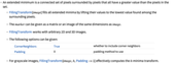 CornerNeighbors True 是否包括拐角邻点 Padding 0 使用的填充方法 - 对于灰度图像,FillingTransform[image,h,Padding->1] 实际上计算 h minima 变换.