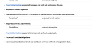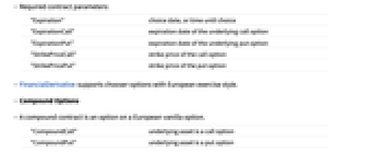 "Expiration" 満期,あるいは満期までの時間 "StrikePrice" 契約の行使価格 - FinancialDerivativeはアメリカンまたはヨーロピアンの行使タイプのバニラコールオプションとバニラプットオプションをサポートする."Vanilla"の名前指定は省略することができる.