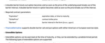 "Expiration" 満期,あるいは満期までの時間 "StrikePrice" 契約の行使価格 "Barriers" {lower,upper}の形式でのバリア区間 - FinancialDerivativeはアメリカンあるいはヨーロピアン行使タイプのダブルバリアのコールオプションとプットオプションをサポートする.