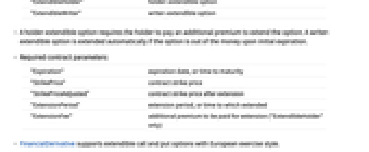 "Expiration" 満期,あるいは満期までの時間 "StrikePrice" 契約の行使価格 "StrikePriceAdjusted" 延長後の契約行使価格 "ExtensionPeriod" 延長期間,あるいは延長期間が終了する日 "ExtensionFee" 延長の際に支払う追加料金("ExtendibleHolder"のみ) - FinancialDerivativeはヨーロピアン行使タイプの延長可能なコールオプションとプットオプションをサポートする.