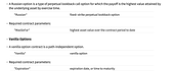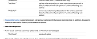 "Expiration" 満期,あるいは満期までの時間 "StrikePrice" 契約行使価格("LookbackFixed"のみ) "MaxSoFar" それまでの契約期間中に原資産が達した最高値("LookbackFixed"コールオプションまたは"LookbackFloating"プットオプション) "MinSoFar" それまでの契約期間中に原資産が達した最低値("LookbackFixed"プットオプションまたは"LookbackFloating"コールオプション) - FinancialDerivativeはヨーロピアン行使タイプのルックバックコールオプションとルックバックプットオプションをサポートする.加えて,アメリカン行使タイプのフローティングストライクルックバックオプションもサポートする.