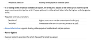 "PerpetualLookback" フローティングストライク満期無限ルックバックオプション - フローティングストライク満期無限ルックバックコールオプションでは,行使価格をそれまでの契約期間に資産が達した最低価格に調整する.プットオプションの場合は,行使価格はそれまでの原資産の最高価格であるとみなされる.