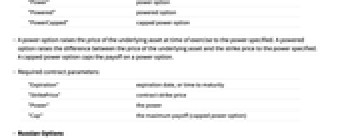 "Power" パワーオプション "Powered" パワードオプション "PowerCapped" キャップドパワーオプション - パワーオプションはもとになる資産価値を行使時に指定されたベキ乗にするオプションである.パワードオプションはもとになる資産と行使価格の差を指定されたベキ乗にするオプションである.キャップドパワーオプションはパワーオプションの支払いにキャップがあるものである.