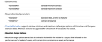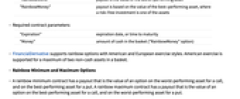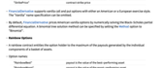 "Expiration" 満期,あるいは満期までの時間 "Money" バスケット内の現金の額("RainbowMoney"オプション) - FinancialDerivativeはアメリカンあるいはヨーロピアン行使タイプのレインボーオプションをサポートする.アメリカン行使タイプはバスケット内の2つの非現金資産の最高額についてサポートされている.