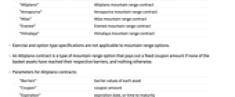 - マウンテンレンジオプションはホールダーが資産バスケットのパフォーマンスに基づいた支払いを受ける権利を有する契約クラスである.資産のパフォーマンスには一定の時間制限がある.