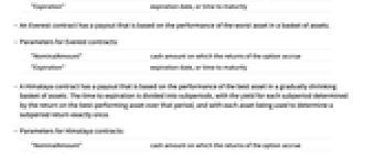 "NominalAmount" オプションのリターンが生じる現金額 "Expiration" 満期,あるいは満期までの時間 - Himalaya契約は次第に小さくなるバスケットの中で最高のパフォーマンスを示す資産に基づいて支払いを行う.満期までの時間がより小さい時間単位に分けられ,各時間単位における支払いはその期間において最良パフォーマンスを示した資産のリターンによって決められる.どの資産も各時間単位のリターンの決定に厳密に1回ずつ使われる.