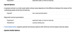 "Expiration" 満期,あるいは満期までの時間 "StrikePrice" 契約の行使価格 - FinancialDerivativeはアメリカンあるいはヨーロピアン行使タイプのスプレッドコールオプションとスプレッドプットオプションをサポートする.