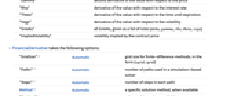 "Value" 言及時の値 "CriticalValue" アメリカンオプションの臨界値 "Delta" 価格に対する値の導関数 "Gamma" 価格に対する値の二次導関数 "Rho" 利率に対する値の導関数 "Theta" 満期までの時間に対する値の導関数 "Vega" 変動率に対する値の導関数 "Greeks" 規則のリスト{delta,gamma,rho,theta,vega}の形で与えられたすべてのギリシャ指標 "ImpliedVolatility" 契約価格で暗示された変動率 - FinancialDerivativeは次のオプションを取る.