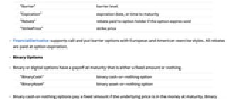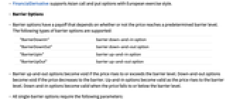 "Barrier" バリアレベル "Expiration" 満期,あるいは満期までの時間 "Rebate" オプションが無効で終了した場合にオプション保有者に払うリベート "StrikePrice" 行使価格 - FinancialDerivativeはヨーロピアンおよびアメリカンの行使タイプのコールバリアオプションとプットバリアオプションをサポートする.すべてのリベートがオプションの終了に伴って支払われる.