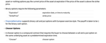 "Expiration" 選択した日,あるいは選択した日までの時間 "ExpirationCall" もとになるコールオプションの満期日 "ExpirationPut" もとになるプットオプションの満期日 "StrikePriceCall" コールオプションの行使価格 "StrikePricePut" プットオプションの行使価格 - FinancialDerivativeはヨーロピアン行使タイプのチューザーオプションをサポートする.