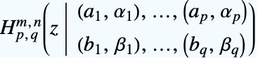 FoxH[{{{a1,α1},…,{an,αn}},{{an+1,αn+1},…,{ap,αp}}},{{{b1,β1},…,{bm,βm}},{{bm+1,βm+1},…,{bq,βq}}},z]
