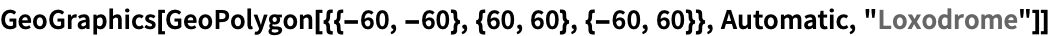 GeoPolygon[locs{intloc}] intloc is an interior location to the geo polygon GeoPolygon[locs,extloc] extloc is an exterior location to the geo polygon GeoPolygon[locs,"SmallerArea"] the interior of the geo polygon is the smaller region GeoPolygon[locs,"LargerArea"] the interior of the geo polygon is the larger region GeoPolygon[locs,"LeftArea"] the interior is to the left as locs are traversed GeoPolygon[locs,"RightArea"] the interior is to the right as locs are traversed - The locations loci can be specified as latitude and longitude coordinates {lat,lon} in degrees, as GeoPosition[{lat,lon}] or as named entities Entity[…].