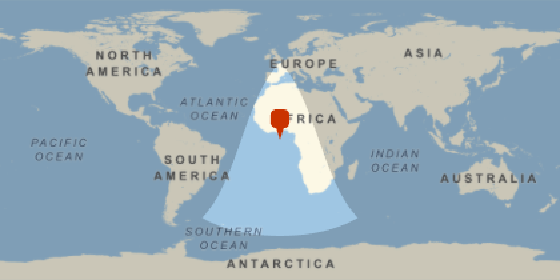 Zoom in around a location in northern Italy to see deviations of the order of a kilometer: