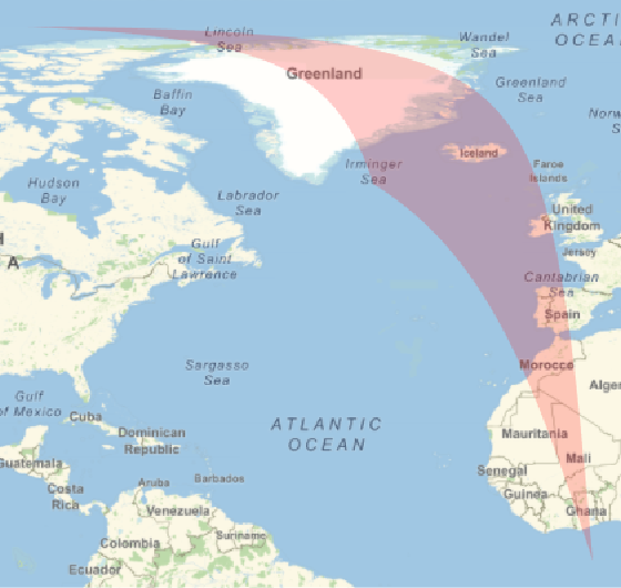 goes through the North Pole, as shown by a small change in the longitude of the first point: