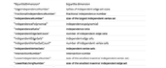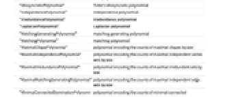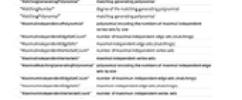 "BipartiteDimension" 二分图维度 "EdgeIndependenceNumber" 独立边集大小的计数 "FractionalIndependenceNumber" 部分独立数(fractional independence number) "IndependenceNumber" 最大独立顶点集的大小 "IndependencePolynomial" 独立多项式 "IndependenceRatio" 独立比值 "IndependentEdgeSetCount" 独立边集的数目 "IndependentEdgeSets" 独立边集 "IndependentVertexSetCount" 独立顶点集的数目 "IndependentVertexSets" 独立顶点集 "IntersectionNumber" 交集数目 "LowerIndependenceNumber" 最小的极大独立顶点集的大小 "LowerMatchingNumber" 最小的极大独立边集的大小 "MatchingGeneratingPolynomial" 匹配生成多项式 "MatchingNumber" 匹配生成多项式的度数 "MatchingPolynomial" 匹配生成多项式 "MaximalIndependencePolynomial" 按大小编码极大独立顶点集数的多项式 "MaximalIndependentEdgeSetCount" 极大独立边集(匹配)的数目 "MaximalIndependentEdgeSets" 极大独立边集(匹配) "MaximalIndependentVertexSetCount" 极大独立顶点集的数目 "MaximalIndependentVertexSets" 极大独立顶点集 "MaximalMatchingGeneratingPolynomial" 按大小编码极大独立边集数的多项式 "MaximumIndependentEdgeSetCount" 极大独立边集(匹配)的数目 "MaximumIndependentEdgeSets" 极大独立边集(匹配) "MaximumIndependentVertexSetCount" 极大独立顶点集的数目 "MaximumIndependentVertexSets" 极大独立顶点集 - 与无冗余集相关的属性包括: