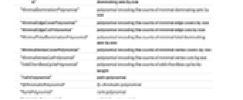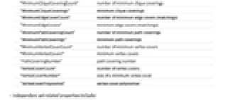 "CliqueCoveringNumber" 覆盖顶点集所需要的的最大团的最小数 "EdgeCoverCount" 边覆盖的数目 "EdgeCoverNumber" 最小边覆盖的大小 "EdgeCoverPolynomial" 边覆盖多项式 "EdgeCovers" 边覆盖 "MinimalEdgeCoverCount" 极小边覆盖的数目 "MinimalEdgeCoverPolynomial" 编码最小边覆盖尺寸计数的多项式 "MinimalEdgeCovers" 极小边覆盖 "MinimalVertexCoverCount" 极小顶点覆盖的数目 "MinimalVertexCoverPolynomial" 编码最小顶点覆盖大小计数的多项式 "MinimalVertexCovers" 极小顶点覆盖 "MinimumCliqueCoveringCount" 最小团覆盖的数目 "MinimumCliqueCoverings" 最小团覆盖 "MinimumEdgeCoverCount" 最小边覆盖(匹配)的数目 "MinimumEdgeCovers" 最小边覆盖(匹配) "MinimumPathCoveringCount" 最小路径覆盖的数目 "MinimumPathCoverings" 最小路径覆盖 "MinimumVertexCoverCount" 最小顶点覆盖的数目 "MinimumVertexCovers" 最小顶点覆盖 "PathCoveringNumber" 路径覆盖的数目 "VertexCoverCount" 顶点覆盖的数目 "VertexCoverNumber" 最小顶点覆盖的大小 "VertexCoverPolynomial" 顶点覆盖多项式 - 独立集相关属性包括: