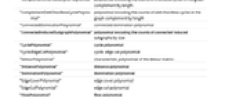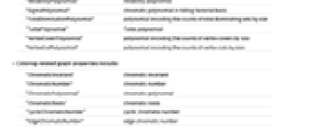"CharacteristicPolynomial" 邻接矩阵的特征多项式 "ChordlessCyclePolynomial" 按长度编码无弦周期计数的多项式 "ChromaticPolynomial" 色多项式 "CliquePolynomial" 团多项式 "CoboundaryPolynomial" 共同边界多项式 "ComplementChordlessCyclePolynimial{ 按长度编码补图中的无弦环数的多项式 "ComplementOddChordlessCyclePolynomial" 按长度编码补图中的奇无弦环数的多项式 "ConnectedDominationPolynomial" 连通支配 (domination) 多项式 "ConnectedInducedSubgraphPolynomial" 按大小编码连通诱导子图数的多项式 "CyclePolynomial" 环多项式 "CyclicEdgeCutPolynomial" 循环边割多项式 "DetourPolynomial" 迂回矩阵的特征多项式 "DistancePolynomial" 距离多项式 "DominationPolynomial" 支配多项式 "EdgeCoverPolynomial" 边覆盖多项式 "EdgeCutPolynomial" 边割多项式 "FlowPolynomial" 流多项式 "IdiosyncraticPolynomial" Tutte 特殊多项式 "IndependencePolynomial" 独立多项式 "IrredundancePolynopmial" 无冗余多项式 "LaplacianPolynomial" 拉普拉斯多项式 "MatchingGeneratingPolynomial" 匹配生成多项式 "MatchingPolynomial" 匹配多项式 "MaximalCliquePolynomial" 按大小编码极大团数的多项式 "MaximalIndependencePolynomial" 按大小编码极大独立顶点集数的多项式 "MaximalIrredundancePolynomial" 按大小编码极大非冗余集数的多项式 "MaximalMatchingGeneratingPolynomial" 按大小编码极大独立边集数的多项式 "MinimalConnectedDominationPolynomial" 按大小编码极小连通支配集数的多项式 "MinimalDominationPolynomial" 按大小编码极小支配集数的多项式 "MinimalEdgeCoverPolynomial" 按大小编码极小边覆盖数的多项式 "MinimalEdgeCutPolynomial" 按大小编码极小边割数的多项式 "MinimalTotalDominationPolynomial" 按大小编码极小总支配集数的多项式 "MinimalVertexCoverPolynomial" 按大小编码极小顶点覆盖数的多项式 "MinimalVertexCutPolynomial" 按大小编码极小顶点割数的多项式 "OddChordlessCyclePolynomial" 按长度编码奇无弦环数的多项式 "PathPolynomial" 路径多项式 "QChromaticPolynomial" Q-色谱多项式 "RankPolynomial" 秩多项式 "ReliabilityPolynomial" 可靠性多项式 "SigmaPolynomial" 下降阶乘基的色多项式 "TotalDominationPolynomial" 按大小编码总支配集数的多项式 "TuttePolynomial" Tutte 多项式 "VertexCoverPolynomial" 顶点覆盖多项式 "VertexCutPolynomial" 按大小编码顶点割数的多项式 - 颜色相关的图属性包括: