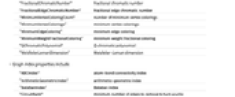 "ChromaticInvariant" 色不变量 "ChromaticNumber" 色数 "ChromaticPolynomial" 色谱多项式 "ChromaticRoots" 色根 "CyclicChromaticNumber" 循环色数 "EdgeChromaticNumber" 边色数 "FractionalChromaticNumber" 分数色数 "FractionalEdgeChromaticNumber" 分数边色数 "MinimumVertexColoringCount" 最小顶点着色数 "MinimumVertexColorings" 最小顶点着色 "MinimumEdgeColoring" 最小边着色 "MinimumWeightFractionalColoring" 最小权值分数着色 "QChromaticPolynomial" Q-色谱多项式 "WeisfeilerLemanDimension" Weisfeiler–Leman 维度 - 图指数属性包括: