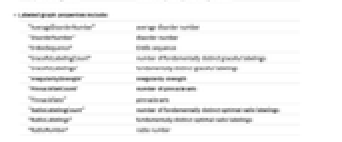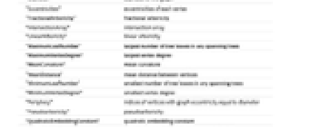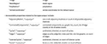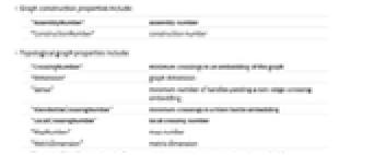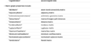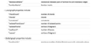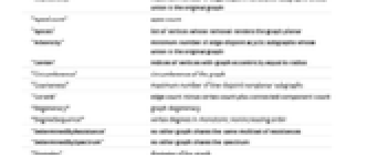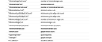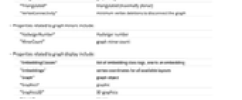 "Density" 图中可能的边所占的比例 "Disconnected" 不连通 "EdgeConnectivity" 为了使图不连通删除的最少边数 "EdgeCutCount" 边割的数量 "EdgeCuts" 边割 (edge cuts) "IncidenceLines" 生成配置的共线顶点的索引 "LambdaComponents" lambda 分量 "LuccioSamiComponents" Luccio–Sami 分量 "MinimalEdgeCutCount" 极小边割的数量 "MinimalEdgeCuts" 极小边割 "MinimalVertexCutCount" 最小顶点割 (vertex-cut) 的数量 "MinimalVertexCuts" 最小顶点割 "MinimumCyclicEdgeCutCount" 最小循环边割数量 "MinimumCyclicEdgeCuts" 最小循环边割 "MinimumEdgeCutCount" 最小边割的计数 "MinimumEdgeCut" 最小边割 "MinimumVertexCutCount" 最小顶点割计数 "MinimumVertexCuts" 最小顶点割 "MinorCount" 图子式计数 "SpanningTrees" 生成树 "Strength" 图形强度 "Toughness" 图形韧度 "Triangulated" 三角化(最大平面) "VertexConnectivity" 为了使图不连通删除的最少点 - 与图子式 (graph minor) 有关的属性包括: