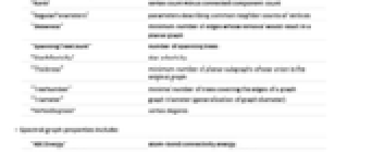 "Anarboricity" 其并集为初始图的边不相交无环子图的最大数目 "ApexCount" 顶点计数 "Apices" 移除会使图变成平面图的顶点的列表 "Arboricity" 其并集为初始图的边不相交无环子图的最小数目 "Center" 图离心率等于半径的顶点的指数 "Circumference" 图的周长 "Coarseness" 线不相交非平面子图的最大数目 "Corank" 边数数目减去顶点数目加上连通分量数目 "Degeneracy" 图的简并性 "DegreeSequence" 单调非递增的顺序中的顶点度 "DeterminedByResistance" 没有其它图共享相同的电阻多重集 "DeterminedBySpectrum" 没有其它图共享频谱 "Diameter" 图的直径 "Eccentricities" 各顶点离心率 "FractionalArboricity" 分数荫度 "IntersectionArray" 相交数组 "LinearArboricity" 线性荫度 "MaximumLeafNumber" 任意生成树中树叶的最大数 "MaximumVertexDegree" 最大顶点度 "MeanCurvature" 平均曲率 "MeanDistance" 顶点间平均距离 "MinimumLeafNumber" 任何生成树中最小的树叶数 "MinimumVertexDegree" 最小顶点度 "Periphery" 图离心率等于直径的顶点的指数 "Pseudoarboricity" 伪荫度 "QuadraticEmbeddingConstant" 二次嵌入常数 "Rank" 顶点数目减去连通分量数目 "RegularParameters" 描述顶点的共有邻居数量的参数 "Skewness" 移除结果为平面图的最小边数 "SpanningTreeCount" 生成树的数目 "StarArboricity" 星形荫度 "Thickness" 并集为原始图的平面子图的最小数目 "TreeNumber" 覆盖图的边的最小数量的树 "Triameter" 图的 triameter(广义图直径) "VertexDegrees" 顶点度 - 谱图特性包括