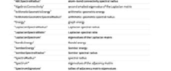"ABCEnergy" 原子-键连接能 "ABCSpectralRadius" 原子-键连接光谱半径 "AlgebraicConnectivity" 拉普拉斯矩阵的第二最小特征值 "ArithmeticGeometricEnergy" 算术-几何能 "ArithmeticGeometricSpectralRadius" 算术几何频谱半径 "Energy" 图能 "LaplacianSpectralRadius" 拉普拉斯频谱半径 "LaplacianSpectralRatio" 拉普拉斯频谱比 "LaplacianSpectrum" 拉普拉斯矩阵的特征值 "RandicEnergy" Randić 能 "SomborEnergy" Sombor 能 "SomborSpectralRadius" Sombor 频谱半径 "SpectralRadius" 频谱半径 "Spectrum" 邻接矩阵的特征值 "SpectrumSignature" 邻接矩阵特征值统计表 - 有标号的图的属性包括: