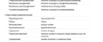 "CrossingNumber" 嵌入图中的最小交叉 "Dimension" 图形维度 "Genus" 产生非边缘交叉嵌入的最小句柄数 "KleinBottleCrossingNumber" 克莱因瓶嵌入的最小交叉 "LocalCrossingNumber" 局部交叉(local crossing)数量 "MapNumber" 地图数量 "MetricDimension" 度量维度 "ProjectivePlaneCrossingNumber" 射影平面嵌入的最小交叉 "RectilinearCrossingNumber" 直线嵌入的最小交叉 "RectilinearLocalCrossingNumber" 直线局部交叉(rectilinear local crossing)数量 "ToroidalCrossingNumber" 环形嵌入的最小交叉 - 团相关属性包括: