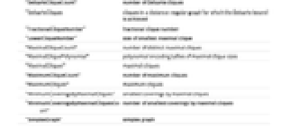 "CliquePolynomial 团多项式 "Cliques 团 "BicliqueNumber" 双团数目 "BipartiteDimension" 二分图维度 "CliqueCount" 团的数目 "CliqueCoveringNumber" 覆盖整个顶点集所需的最大团的最小数目 "CliqueNumber" 最大团中的顶点数 "DelsarteCliqueCount" Delsarte 团的数量 "DelsarteCliques 距离正则图中达到 Delsarte 边界的团 "FractionalCliqueNumber" 分数团数目 "LowerCliqueNumber" 最小极大团的尺寸 "MaximalCliqueCount" 不同的极大团的数目 "MaximalCliquePolynomial" 编码最大团大小计数的多项式 "MaximalCliques" 极大团 "MaximumCliqueCount" 极大团的数目 "MaximumCliques" 最大团 "MinimumCoveringsByMaximalCliques" 通过最大团的最小覆盖 "MinimumCoveringsByMaximalCliquesCount" 通过最大团的最小覆盖数 "SimplexGraph" 单纯形图 - 覆盖相关属性包括: