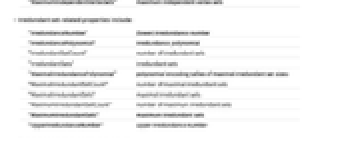 "ABCIndex" 原子-键连接性指数 "ArithmeticGeometricIndex" 算术几何指数 "BalabanIndex" Balaban 指数 "CircuitRank" 移除的最小边数变成非周期性 "DetourIndex" 迂回指数 "HararyIndex" Harary 指数 "HosoyaIndex" Hosoya 指数 "KirchhoffIndex" Kirchhoff 指数 "KirchhoffSumIndex" Kirchhoff 总和指数 "MolecularTopologicalIndex" 分子拓扑(第二 Schultz)指数 "RandicIndex" Randić 指数 "SomborIndex" Sombor 指数 "StabilityIndex" 稳定指数 "TopologicalIndex" 拓扑(第一 Schultz)指数 "WienerIndex" Wiener 指数 "WienerSumIndex" Wiener 总和指数 "ZagrebIndex1" 第一 Zagreb 指数 "ZagrebIndex2" 第二 Zagreb 指数 - 矩阵图的属性包括: