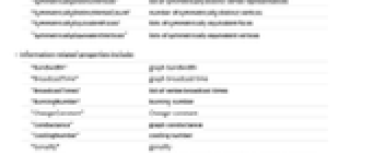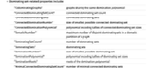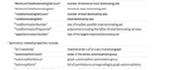 "IrredundanceNumber" (下)无赘数 "IrredundancePolynomial" 无赘多项式 "IrredundantSetCount" 无冗余集的数目 "IrredundantSets" 无冗余集 "MaximalIrredundancePolynomial" 编码极大非冗余集大小计数的多项式 "MaximalIrredundantSetCount" 极大无冗余集的数目 "MaximalIrredundantSets" 极大无冗余集 "MaximumIrredundantSetCount" 最大无冗余集的数目 "MaximumIrredundantSets" 最大无冗余集 "UpperIrredundanceNumber" (上)无赘数 - 与支配集相关的属性包括: