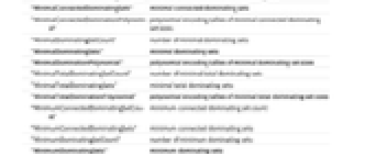 "CodominatingGraphs" 共享支配多项式的图 "ConnectedDominatingSetCount" 连通的支配集数 "ConnectedDominatingSets" 连通的支配集 "ConnectedDominationNumber" 连通支配集可能的最少点数 (smallest possible size) "ConnectedDominationPolynomial" 编码连通支配集大小计数的多项式 "DomaticNumber" 图的控制划分中不相交支配集的最大数量 "DominatingSetCount" 支配集的数目 "DominatingSets" 支配集 "DominationNumber" 支配集的最小可能大小 "DominationPolynomial" 编码支配集大小计数的多项式 "DominationRoots" 支配多项式的根 "MinimalConnectedDominatingSetCount" 极小连通支配集的数目 "MinimalConnectedDominatingSets" 极小连通支配集 "MinimalConnectedDominationPolynomial" 编码极小连通支配集大小计数的多项式 "MinimalDominatingSetCount" 极小支配集的数目 "MinimalDominatingSets" 极小支配集 "MinimalDominationPolynomial" 编码极小支配集大小计数的多项式 "MinimalTotalDominatingSetCount" 极小总支配集数 "MinimalTotalDominatingSets" 极小总支配集 "MinimalTotalDominationPolynomial" 编码极小总支配集大小计数的多项式 "MinimumConnectedDominatingSetCount" 最小连通的支配集数 "MinimumConnectedDominatingSets" 最小连通的支配集 "MinimumDominatingSetCount" 最小支配集的数目 "MinimumDominatingSets" 最小支配集 "MinimumTotalDominatingSetCount" 极小总支配集数目 "MinimumTotalDominatingSets" 极小总支配集 "TotalDominatingSetCount" 总支配集数目 "TotalDominatingSets" 总支配集 "TotalDominationNumber" 最小可能的总支配集的大小 "TotalDominationPolynomial" 编码总支配集大小计数的多项式 "UpperDominationNumber" 最大的极大支配集的大小 - 对称性相关属性包括: