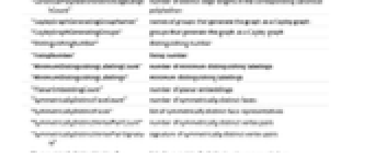"ArcTransitivity" s-弧传递图的最大阶数 s "AutomorphismCount" 顶点同构群的阶 "AutomorphismGroup" 图同构置换群 "Automorphisms" 与图的自同构对应的排列的列表 "CanonicalPolyhedronDistinctEdgeLengthCount" 相应的正规多面体中不同边长的数目 "CayleyGraphGeneratingGroupNames" 生成凯莱图的群的名称 "CayleyGraphGeneratingGroups" 生成凯莱图的群 "DistinguishingNumber" 可区别的数目 "FixingNumber" 固定数目 "MinimumDistinguishingLabelingCount" 最小可区别标记的数目 "MinimumDistinguishingLabelings" 最小可区别标记 "PlanarEmbeddingCount" 平面嵌入数 "SymmetricallyDistinctFaceCount" 对称的不同面的数目 "SymmetricallyDistinctFaces" 对称的不同面表示的列表 "SymmetricallyDistinctVertexPairCount" 对称相异顶点对的数量 "SymmetricallyDistinctVertexPairSignature" 对称相异顶点对的签名 "SymmetricallyDistinctVertices" 对称的不同顶点表示的列表 "SymmetricallyDistinctVertexCount" 对称的不同顶点的数目 "SymmetricallyEquivalentFaces" 对称等价面的列表 "SymmetricallyEquivalentVertices" 对称等价顶点的列表 - 与信息相关的属性包括: