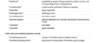 "LovaszNumber" Lovász 数(香农容量的估计) "Pathwidth" 图页宽 "PebblingNumber" pebbling 数 "ScrambleNumber" scramble 数 "ShannonCapacity" 在图表示的交流模型中的有效字母表大小 "TreeDepth" 树深 "Treewidth" 图树宽 - 与路径和圈相关的属性包括: