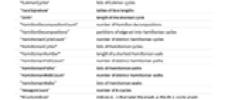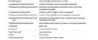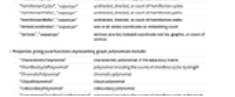 "ChordlessCycleCount" 无弦环数 "ChordlessCyclePolynomial" 编码无弦环长度计数的多项式 "ChordlessCycles" 无弦环 "ComplementChordlessCycleCount" 图补中的无弦环数 "ComplementChordlessCyclePolynomial" 按长度计算的补图无弦环多项式编码符 "ComplementChordlessCycles" 图中长度至少为 4 的无弦环 "ComplementOddChordlessCycleCount" 补图的奇无弦环数 "ComplementOddChordlessCyclePolynomial" 编码补图的奇无弦环长度计数的多项式 "ComplementOddChordlessCycles" 补图的奇无弦环 "CubeGraph" 立方图 (graph cube) "CycleCount" 不同环的数目 "CyclePolynomial" 环多项式 "Cycles" 环列表 "EulerianCycleCount" 不同欧拉环的数目 "EulerianCycles" 欧拉环列表 "FaceSignature" 面长度的计数 "Girth" 最短环的长度 "HamiltonDecompositionCount" 哈密顿分解的数目 "HamiltonDecompositions" 边集到哈密顿环的划分 "HamiltonianCycleCount" 不同哈密顿环的数目 "HamiltonianCycles" 哈密顿环的列表 "HamiltonianNumber" 最短哈密顿行走的长度 "HamiltonianPathCount" 不同哈密顿路径的数目 "HamiltonianPaths" 哈密顿路径的列表 "HamiltonianWalkCount" 不同哈密顿行走的数目 "HamiltonianWalks" 哈密顿行走的列表 "HexagonCount" 6-环的数目 "KCyclicIndices" 标记图为第 个