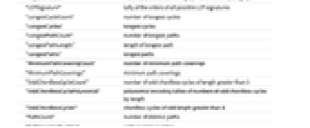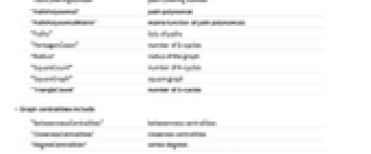 "LCFSignature" 所有可能 LCF 签名的阶数的计数 "LongestCycleCount" 最长环的数目 "LongestCycles" 最长环 "LongestPathCount" 最长路径数 "LongestPathLength" 最长路径长度 "LongestPaths" 最长路径 "MinimumPathCoveringCount" 最小路径覆盖的数目 "MinimumPathCoverings" 最小路径覆盖 "OddChordlessCycleCount" 奇无弦环数 "OddChordlessCyclePolynomial" 按长度编码奇无弦环数计数的多项式 "OddChordlessCycles" 奇数长度大於 3 的无弦环 "PathCount" 不同路径数 "PathCoveringNumber" 路径覆盖数目 "PathPolynomial" 路径多项式 "PathPolynomialMatrix" 路径多项式的矩阵函数 "Paths" 路径列表 "PentagonCount" 5-环数目 "Radius" 图半径 "SquareCount" 4-环数目 "SquareGraph" 方形图 (square graph) "TriangleCount" 3-环数目 - 图中心度包括: