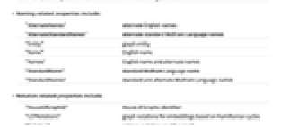"AlternateNames" 英文替代名称 "AlternateStandardNames" 标准 Wolfram 语言替代名称 "Entity" 图实体 "Name" 英文名称 "Names" 英文名称及替代名称 "StandardName" 标准 Wolfram 语言名称 "StandardNames" 标准和替代 Wolfram 语言名称 - 与符号相关的属性包括: