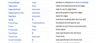 DataRange Automatic 生成する頂点の座標の範囲 DirectedEdges False RuleをDirectedEdgeと解釈するかどうか EdgeLabels None 辺のラベルとその置き方 EdgeLabelStyle Automatic 辺のラベルのスタイル EdgeShapeFunction Automatic 辺の図形を生成する EdgeStyle Automatic 辺のスタイル GraphLayout Automatic 頂点と辺をどのように並べるか GraphHighlight {} ハイライトする辺と頂点 GraphHighlightStyle Automatic ハイライトのスタイル Method Automatic 使用するメソッド PerformanceGoal Automatic パフォーマンスのどの面について最適化するか PlotStyle Automatic スタイルを決定するグラフィックス指示子 PlotTheme Automatic グラフの全体的なテーマ VertexCoordinates Automatic 頂点座標 VertexLabels None 頂点のラベルとその置き方 VertexLabelStyle Automatic 頂点ラベルに使うスタイル VertexShape Automatic 頂点の形 VertexShapeFunction Automatic 頂点の形を生成する VertexSize Automatic 頂点の大きさ VertexStyle Automatic 頂点のスタイル - VertexCoordinates->Automaticの設定のとき,頂点の埋込みと辺の経路は,GraphLayoutの設定に基づいて自動的に計算される.