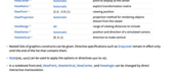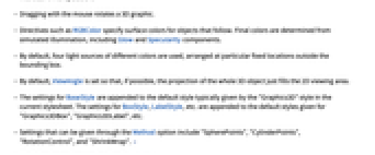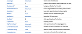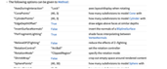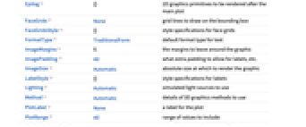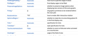 "AxesDuringInteraction" "Lock" 旋转时轴的布局/显示 "ConePoints" {40,3} 有多少个细分来模拟 Cone "CylinderPoints" {40,3} 有多少个细分来模拟 Cylinder "EdgeDepthOffset" True 在相似深度的面上绘制边 "InvertSurfaceNormals" False 反转 BSplineSurface 的法线 "PerFragmentLighting" True 对在 VertexNormals 之间插值的面进行着色 "RelieveDPZFighting" False 减少 Z-fighting 的效果 "RotationControl" "ArcBall" 设置旋转控制器 "RotationMode" "ClippedRegion" 指定旋转模式 "ShrinkWrap" False 裁剪出渲染内容周围的空白空间 "SpherePoints" {40,30} 有多少个细分来模拟 Sphere "SplinePoints" {7,7} 有多少个细分来模拟 BSplineSurface "TubePoints" Automatic 有多少个细分来模拟 Tube - Graphics3D[] 给出一个三维空图.