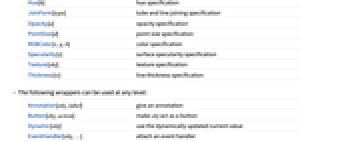 AbsoluteDashing[{w1,…}] 指定绝对虚线 AbsolutePointSize[d] 指定绝对点的尺寸 AbsoluteThickness[w] 指定绝对线宽 Arrowheads[spec] 箭头头部指定 CMYKColor[c,m,y,k] 指定颜色 CapForm[type] 管和线帽指定 Dashing[{w1,…}] 指定虚线 Directive[g1,g2,…] 复合图形指令 EdgeForm[spec] 指定多边形边 FaceForm[spec] 指定多边形的面 Glow[c] 指定发光色 GrayLevel[i] 指定灰度 Hue[h] 指定色调 JoinForm[type] 管和线连接指定 Opacity[a] 不透明度指定 PointSize[d] 指定点的尺寸 RGBColor[r,g,b] 颜色指定 Specularity[s] 表面反射指定 Texture[obj] 纹理指定 Thickness[w] 指定线的粗细 - 可以在任意层使用下面的封装: