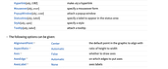 Annotation[obj,label] 给出一个注解 Button[obj,action] 将 obj 作为一个按钮 Dynamic[obj] 动态更新当前值 EventHandler[obj,…] 一个事件处理器 Hyperlink[obj,URI] 将 obj 制作一个超链接 Mouseover[obj,over] 指定一个鼠标移动形式 PopupWindow[obj,cont] 弹出窗口 StatusArea[obj,label] 在状态栏区域指定一个标签 Style[obj,opts] 指定一个样式 Tooltip[obj,label] 添加一个工具提示 - 可以给出下列选项: