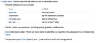 None ラベルは付けない Automatic 自動ラベル "Expressions" 式をラベルとして使う Placed[lbl,pos] 位置 pos にラベルを置く {lbl1,lbl2,…} i 番目のラベルに lbliを使う