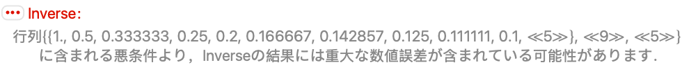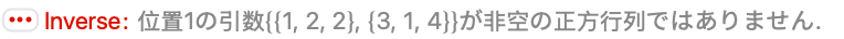 - Inverse[m,ZeroTest->test]は,行列の要素がゼロであるかどうかを判断するために test[m[[i,j]]]を評価する.