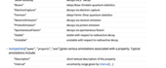 "Boson" ボーズ・アインシュタイン(Bose-Einstein)量子統計に従う "ElectronCapture" 電子捕獲による崩壊 "Fermion" フェルミ・ディラック(Fermi-Dirac)量子統計に従う "NeutronEmission" 中性子放射による崩壊 "ProtonEmission" 陽子放射による崩壊 "SpontaneousFission" 自発核分裂による崩壊 "Stable" 放射性崩壊の面で安定 "Unstable" 放射性崩壊の面で不安定 - IsotopeData["name","property","ann"]は特性に関連したさまざまな注釈を返す.以下は,よく使われる注釈の例である.