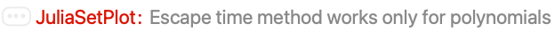 - Method->"EscapeTime"あるいはMethod->"OrbitDetection"とすると,JuliaSetPlotはRasterプリミティブを含むGraphicsオブジェクトを作成する.