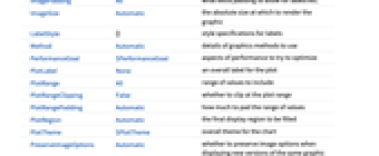 AspectRatio 1/GoldenRatio 全体的な縦横比 Axes True 軸を描くかどうか ChartBaseStyle Automatic 棒の全体的なスタイル DateFunction Automatic どのように日付を標準形に変換するか EventLabels None ラベルを付ける事象 GridLines Automatic 描画する格子線 GridLinesStyle Automatic 格子線のスタイル PerformanceGoal $PerformanceGoal パフォーマンスのどの面について最適化するか PlotTheme $PlotTheme グラフの全体的なテーマ ScalingFunctions None y 軸をどのようにスケールするか TargetUnits Automatic グラフ内に表示する単位 TrendStyle Automatic 上昇傾向と下降傾向をどのようにスタイリングするか - ScalingFunctions->syのとき,関数 sy は値に適用される.ScalingFunctionsは表示のみに影響し,コントロールには影響しない.
